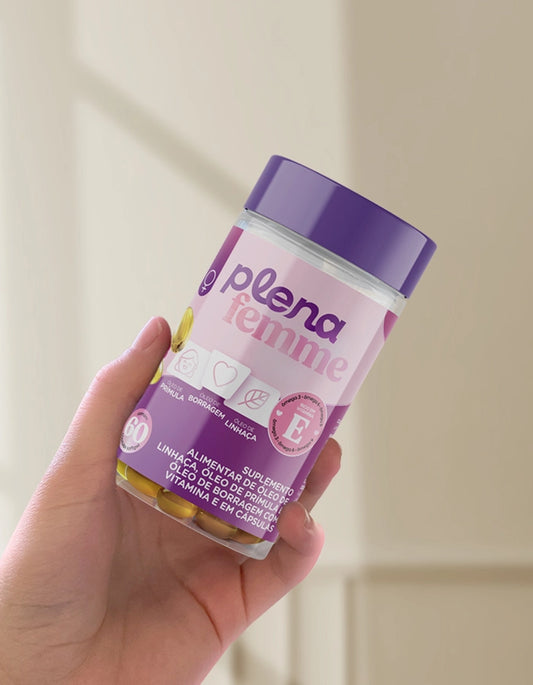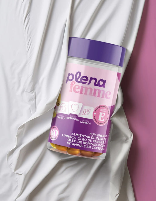 Plena Femme é composto por ingredientes naturais como óleo de linhaça (fonte de ômega-3), óleo de prímula (rico em ácido gama-linolênico - GLA), óleo de borragem e vitamina E. Cada componente foi escolhido por seus benefícios comprovados para a saúde hormonal, imunológica e da pele.